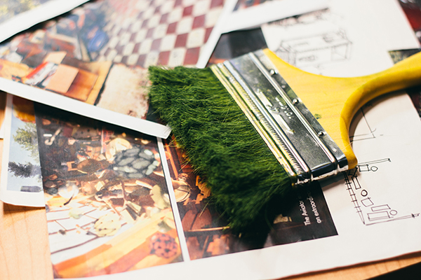 黃風然運用了很多素材,有珍珠板、木頭、塑膠、金屬,也有真的植物。其中草坪的部分,更是使用油漆刷的毛,染色之後,再用鑷子一根根來「種」。草地泥土使用咖啡粉與白膠黏製,地球儀則是用扭蛋殼來製作,細心畫上世界地圖,活用各種想不到的素材。手工如此耗時,才能保留樸拙而真誠的心意。