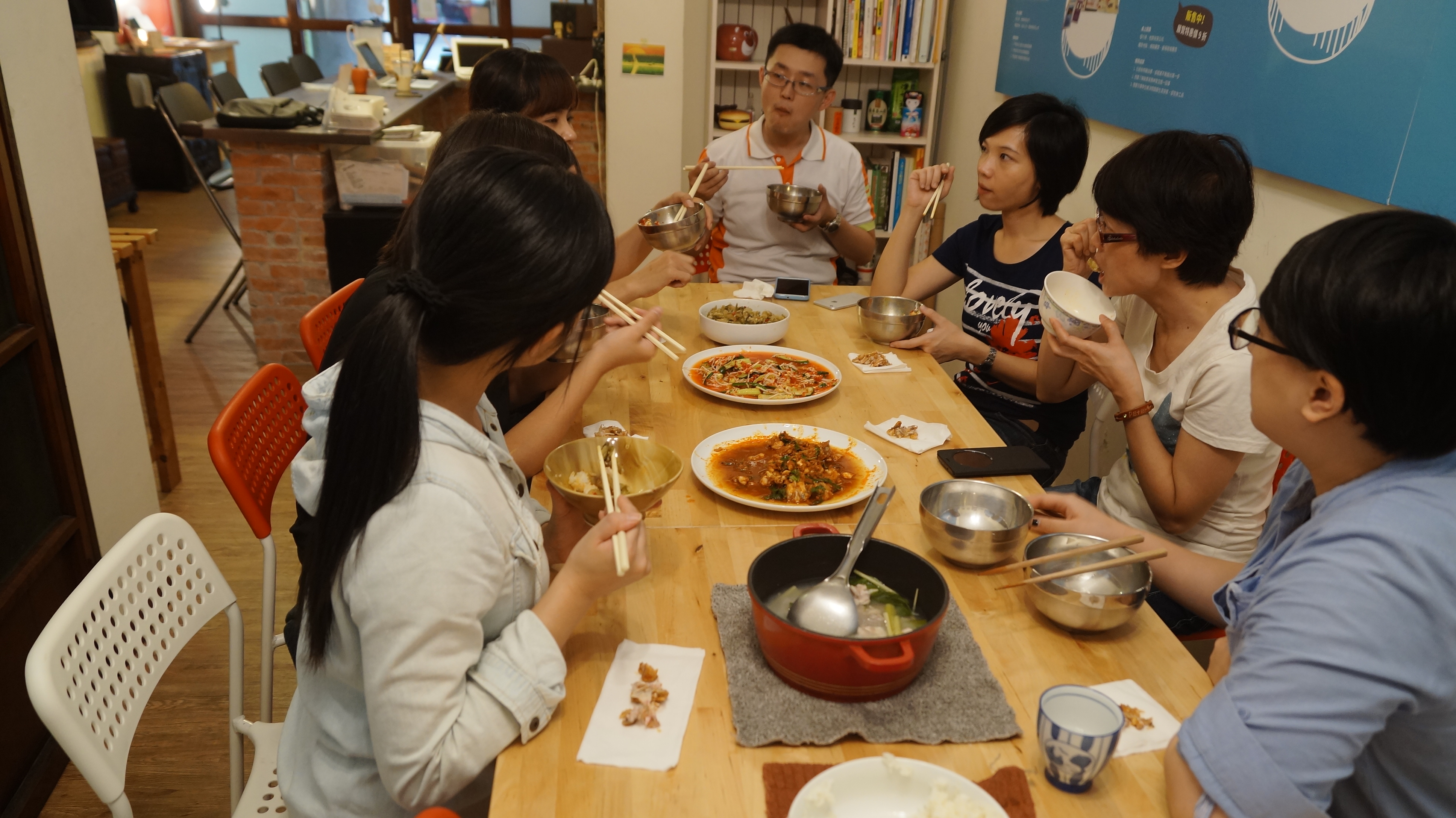 藏匿在通化夜市附近的巷弄裡,有一個名叫「來坐夥」的共享空間,門口的看板寫著:可以來工作、上網、讀書、聚會、下廚和玩桌遊,入場費 150 元,不限時、外食 OK。「其實很多人經過,看了板子還是不知道我們是幹嘛的。」創辦人之一的吳東軒笑說,共享空間對於附近的居民來說,依然是個模糊抽象的概念,需要長時間慢慢累積客源。