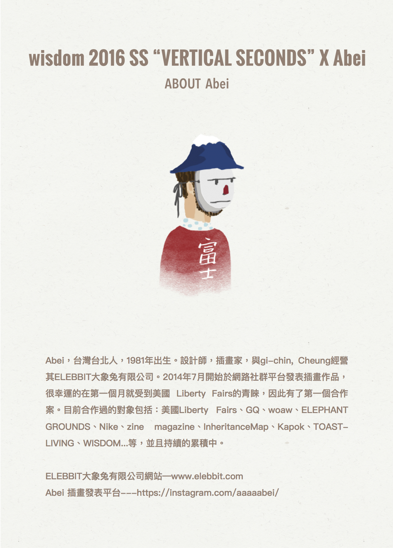 Abei,台灣台北人,1981 年出生。設計師,插畫家,與 gi-chin, Cheung 經營其 ELEBBIT 大象兔有限公司設計工作室。2014 年 7 月開始於網路社群平台發表插畫作品,很幸運的在第一個月就受到美國 LibertyFairs 的青睞,因此有了第一個合作案。目前合作過的對象包括:美國 Liberty Fairs、GQ、woaw、ELEPHANT GROUNDS、Nike、zine magazine、Inheritance Map、Kapok、TOASTLIVING、WISDOM...等,並且持續的累積中。