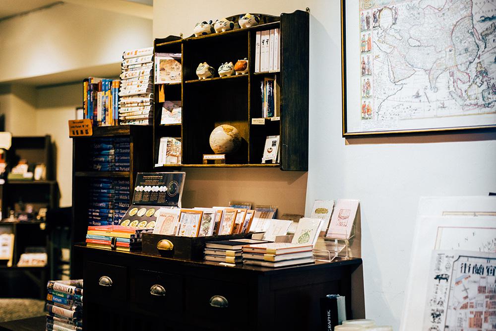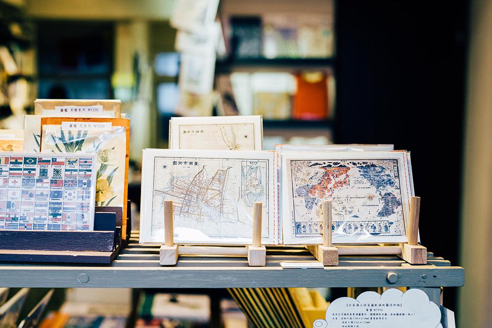 書店中也擺放許多旅行相關雜貨,如筆記本、地圖、地球儀、各式明信片等等。其中,可隨手摺疊的軟材質地圖設計精美,令人想收藏;來自各地的明信片有復古台灣插畫、也有典雅的歐洲蝴蝶、貝殼插畫,帶走一張貼在家中牆上,隨時觸動探險的慾望。店內也有許多台灣獨立刊物,從家鄉開始展開旅程,不忘關懷土地。