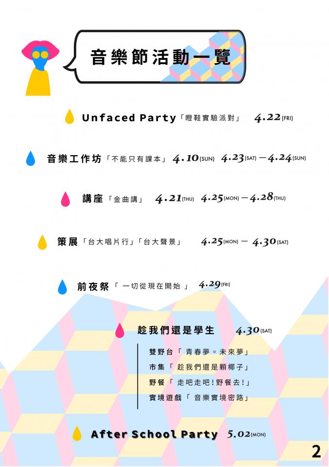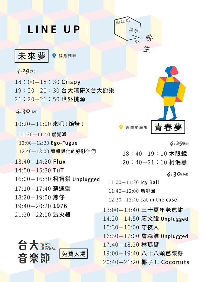 天氣漸漸轉熱的四月天,想好要到哪裡盡情遊玩或是放鬆自己了嗎?無論你是已經步入職場的上班族、即將離開校園的畢業生還是剛進入全新校園環境的新鮮人,給自己一個揮灑青春的機會吧!4 月 30 日星期六,第三屆台大音樂節的重頭戲─野台表演即將在台大醉月湖畔熱鬧登場,把音樂當作生活養分的你,千萬別錯過!