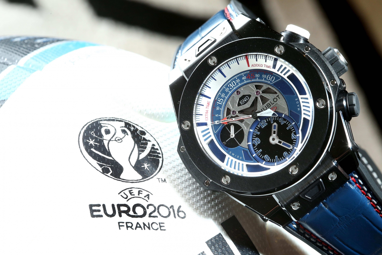 2016 歐洲盃(UEFA EURO 2016™)將於 6 月 10 日至 7 月 10 日於法國舉行,Hublot 為紀念第三次與歐洲國家盃合作,隆重推出官方腕錶-Big Bang Unico 歐洲盃逆跳計時腕錶 (Big Bang Unico Retrograde Chronograph Euro)。靈感源自於第十五屆歐洲國家盃主辦國法國的三色國旗,直徑 45mm 的黑陶瓷錶殼飾以紅、白、藍三色,搭配帶有 “One Click” 單鍵替換錶帶裝置的藍色鱷魚皮內襯黑色天然橡膠錶帶,以白色和紅色縫線縫製。限量 100 只。
