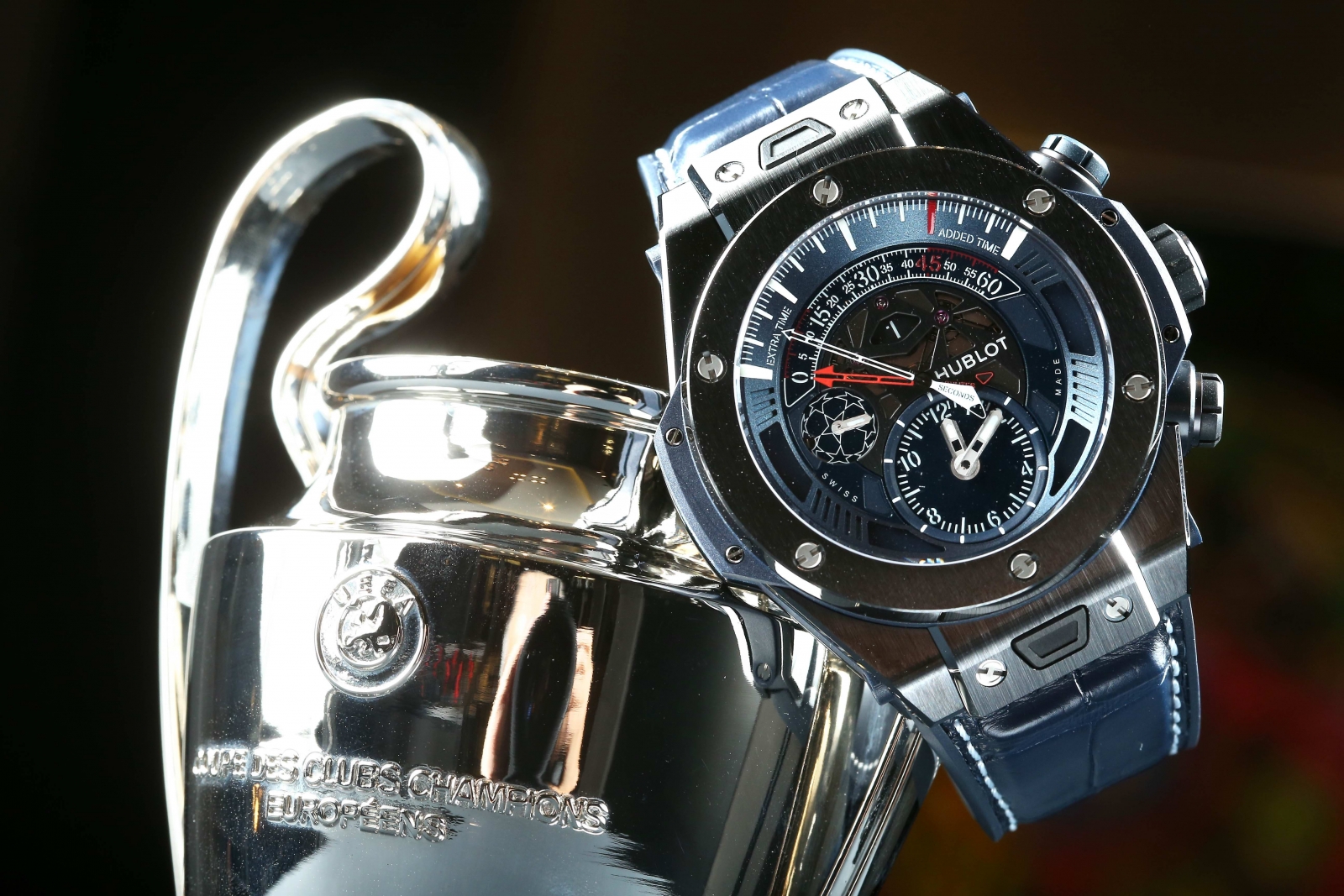 為慶祝 Hublot 成為歐洲冠軍聯賽官方合作夥伴(UEFA CHAMPIONS LEAGUE™),Hublot 特別推出第二款搭載 Hublot著名 Unico 逆跳計時機芯的限量 100 只足球腕錶-Big Bang Unico 歐洲冠軍聯賽逆跳計時腕錶(Big Bang Unico Retrograde Chronograph Champions League)。採用精巧的 Unico 逆跳計時機芯,並以代表歐洲冠軍聯賽的午夜藍呈現整體色調,搭配直徑45mm黑色陶瓷錶殼,藍色鱷魚皮內襯黑色天然橡膠錶帶,以藍色縫線縫製。