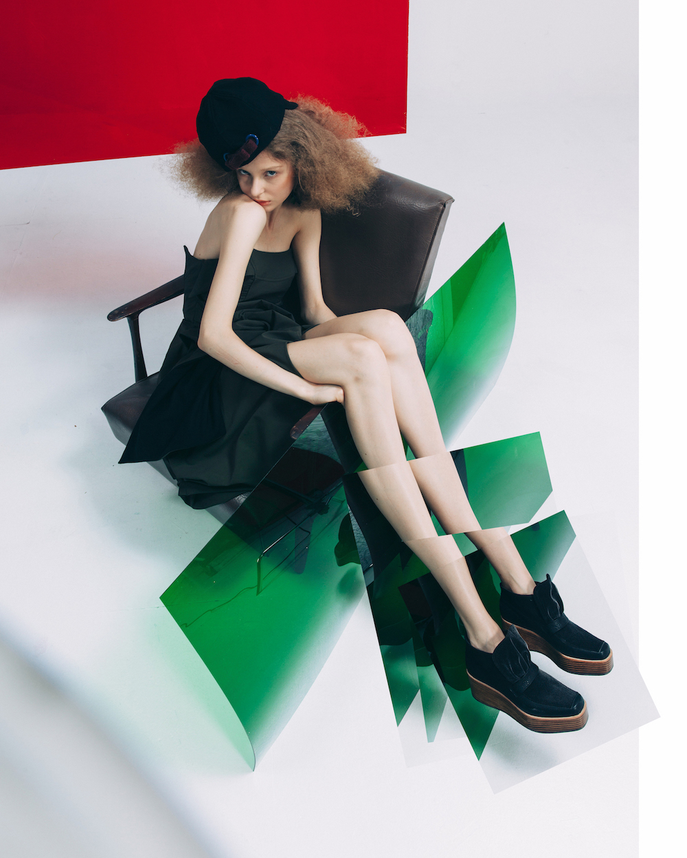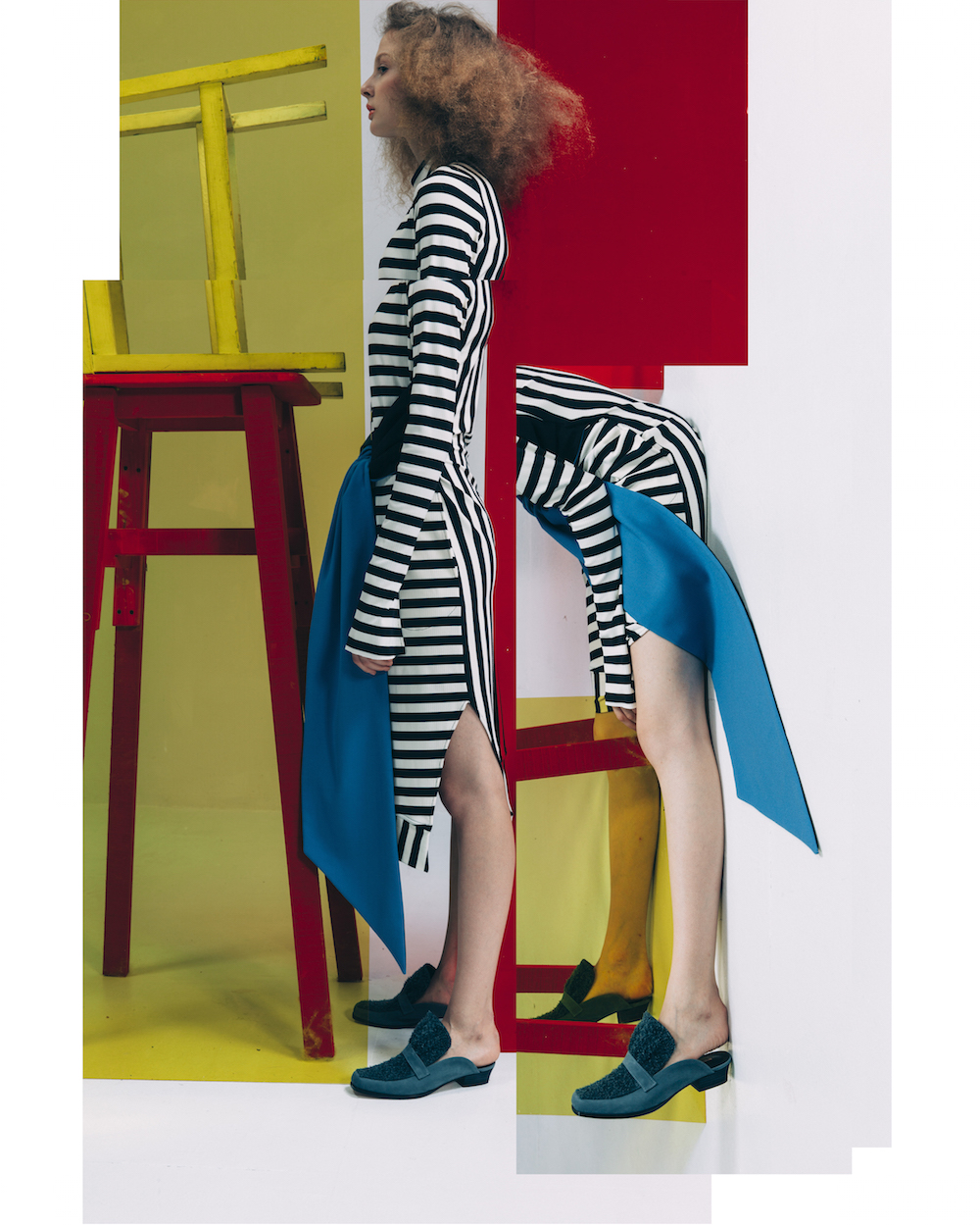 將服裝視為大人的著色本,Envol Avec Ning 以色塊、大片條紋、格紋勾勒出本季的重點架構,大幅添入寶藍、鵝黃、橘紅三種主色為肌理、並結合各式誇張細節:喇叭袖與束腰,如品牌標記的大蝴蝶結被運用在長版百摺與高領開衩連身裙上,大膽營造強烈的視覺感受。