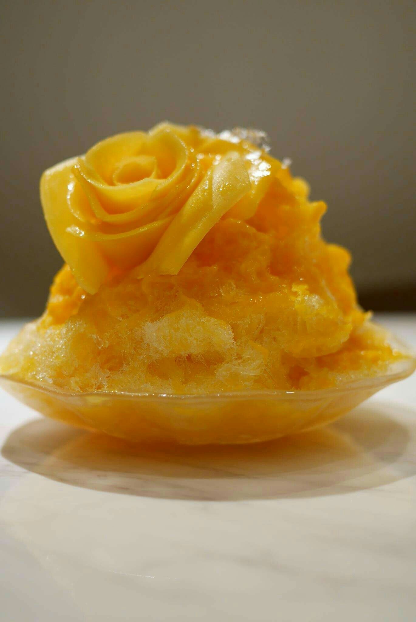 中秋連假首日,特別邀請日本知名節目「行列のできる法律相談所」藝人票選第一名的甜點店 été 主廚–庄司夏子,以其最受歡迎採全預約訂製的 Fleur d'été 甜點為概念,於店內一日限定推出的「金黃玫瑰芒果冰」。