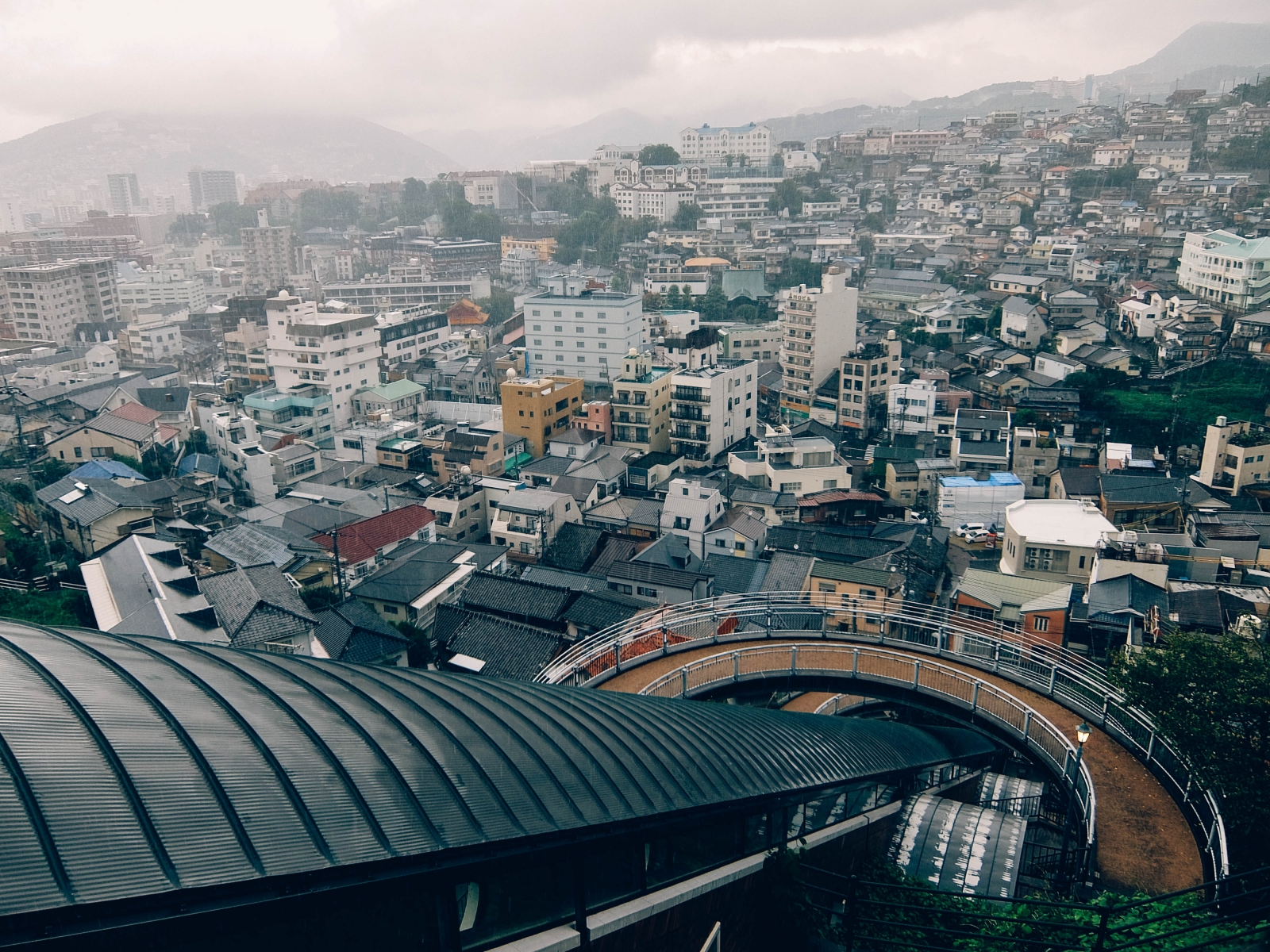 臨行前開始下起小雨,決定暫時在思案橋喝一杯長崎風奶昔(ミルクセーキ)。以為這就是氣象報告所謂的傍晚有雨,沒想到登上グラバー園後一陣暴雨,穿上雨具在陡峭的下坡中小心翼翼地前往ドンドン坂聽雨,結果雨勢太大,沒聽到咚咚聲只有水溝奔流。唯一堪以慰藉的是走下大浦天主堂時,雨後陽光將整個港面照得晶亮絕美,也順利在太陽下山前趕到長崎縣美術館。隈研吾的和風木構配上水面日夜變化的光影流動令人難以抗拒,在展望台看著夕日消失在山後,港景慢慢亮起更是無上享受。坂道的高度開發與大量的河川加蓋訴說著長崎向水爭陸的痕跡,但除了美術館外,水岸大型商業設施、公園的建立、與出島區域的再開發都反映了近年從造陸重回親水的思維,或許我們有生之年將會看到出島重新浮在中島川的河口。