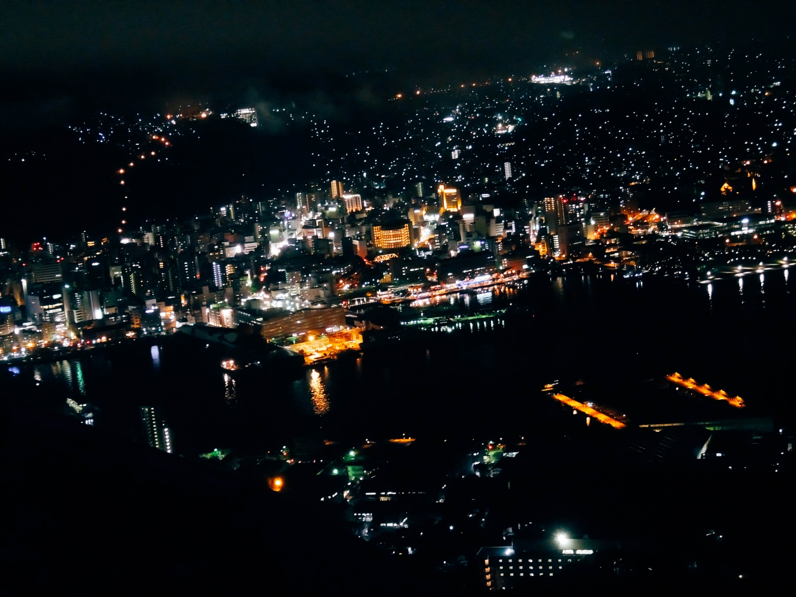 在中華街吃碗強棒麵(ちゃんぽん)當晚餐,稻佐山展望台平時人潮眾多,晚上便預約了當地的夜景觀光旅遊直接攻頂。接近山頂的某個角度車掌請我們看右手邊的浦上地區,放眼過去卻是一片黑,原來山頂開始起霧,遠方的電波塔在霧中發出詭異的光芒,「這裡看不到,山頂大概就很難看到了。」導遊如是說。忽然意識到 1500 圓可能什麼都看不到就投進水裡,實在難掩心中動搖。軍艦島渡航不一定能上岸,沒想到稻佐山登頂也不一定有夜景,長崎的風雲莫測更甚於景點的千變萬化。上了展望台,原本還看得到一些光影,不久後就是一片黑,這才想起夜裡霧是黑的,果然是日本的黑霧。因為什麼都看不到,整個展望台的人都找起地上的心型燈光擠在同一處拍照,實在滑稽。就在大家意興闌珊時,一陣風將雲霧漸漸吹散,先從長崎站前到大波止的商業區開始亮起,再來是南山手,遠方的女神大橋,迷霧散盡露出西岸的工業區燈火,〈長崎小夜曲〉形容這樣的港都夜色就像從山上跳進珠寶盒,幸運的夜景終於讓整座展望台的人今晚都能安睡了。