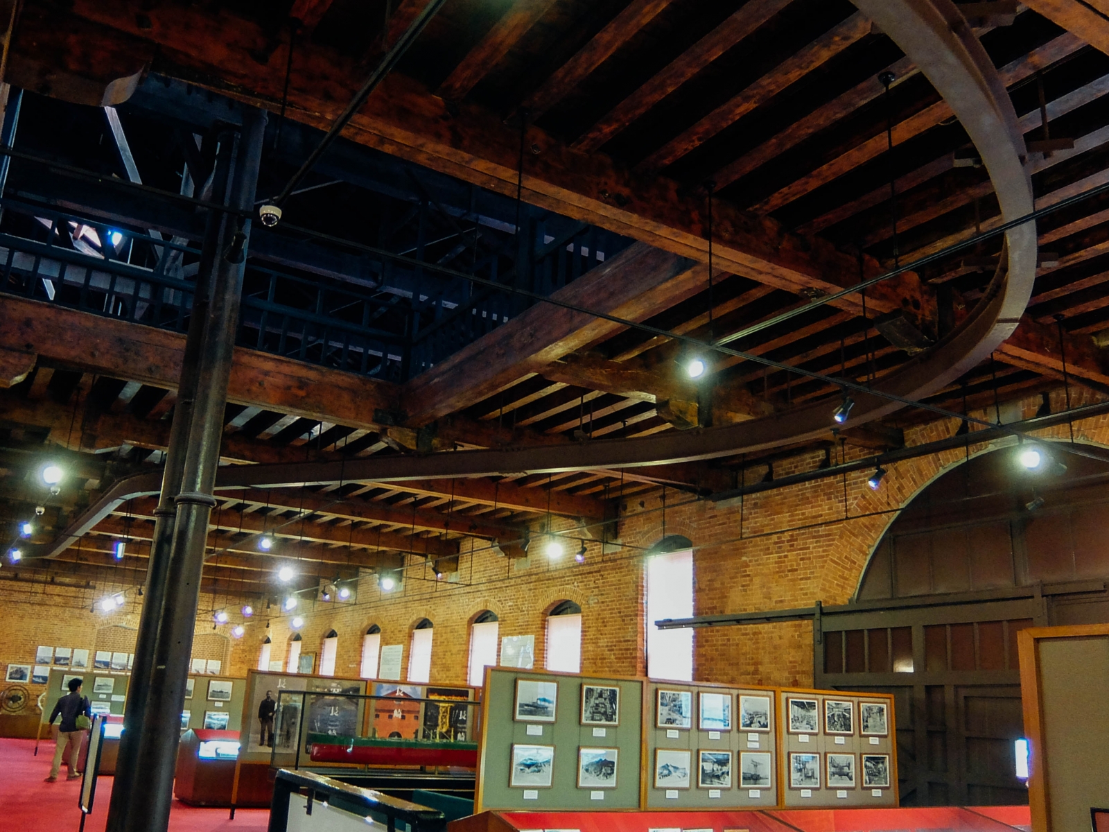 到了廠區,澎湃海風鼓動著大門正中的三菱大旗,車掌請訪客收起所有的攝影器材,特別繞路讓人近距離觀賞征戰百年的巨型懸臂起重機。轉個彎來到最早稱為長崎製鐵所,後成為長崎造船所的紅磚廠房。這棟建築的原料是全進口的,除了英國製的鑄鐵柱、美國堅固的木材為礎構外,當時日本沒有燒製紅磚的技術,開國後在有限的燒製技術下,由荷蘭技術軍官哈迪斯指導製作被稱為「蒟蒻磚」的薄型紅磚。屋頂的自然採光與通風設計,流水線上的吊車軌道以優雅的弧線繞行側門直接供應資材,門外尚有台車的軌道痕跡,一切以生產效率為前提。這裡是日本近代工業的發端之地。