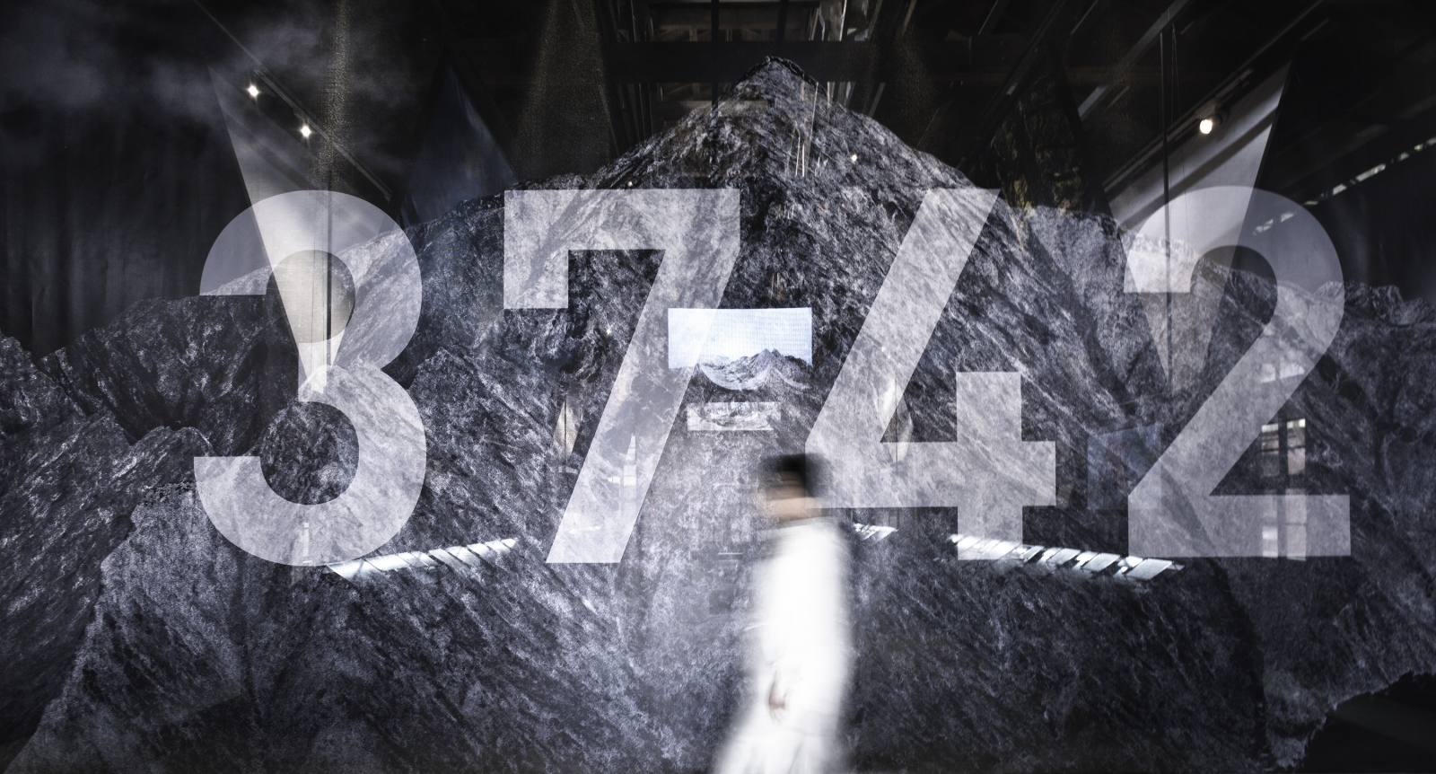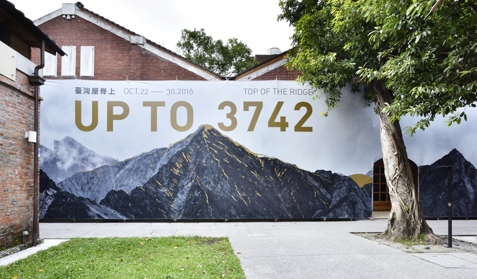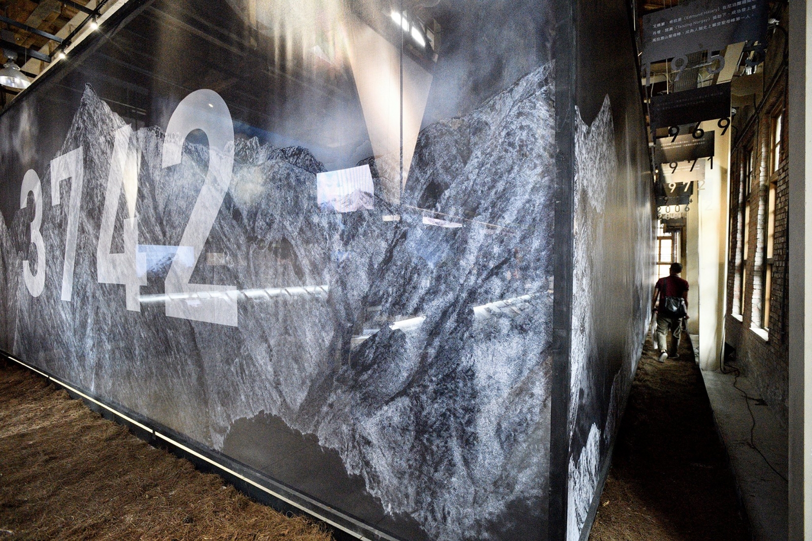 屏棄以往展覽一入場就能看到展區全貌的設計手法,在紅磚展區的長方平面上,拉伸出四面等比內縮的黑色網屏,建構出具有穿透視野的屏蔽介面,分隔內外,並透過置換出入口,反轉展場原本的軸線與相對位置,創造出外部走道。入口地坪鋪設如毯的松針,在展覽起點開始蔓延,經由黑色網屏的牽引下,引領觀者開展對於山的探尋。待行至展場後方,視野豁然開朗,中央尖聳立眼前,南湖群峰左右開展,四面皆景,在穿透性的觀看經驗中,人成為空間的風景,也成為山林的一部分。主展區節奏明快,挑高的歷史建築上方以鋼鎖懸吊天幕成翼,拉撐出山的姿態,下方由4道生鐵鍛造的向斜結構區劃而成,收納參展者的創作與感知。中軸線上,三個淨白的圓形台座搭載虛擬實境的科技,過渡 3,742 公尺海拔的時空,引領觀者跳脫現場,進入山林、雲霧、巨岩、山脊的全新視界。