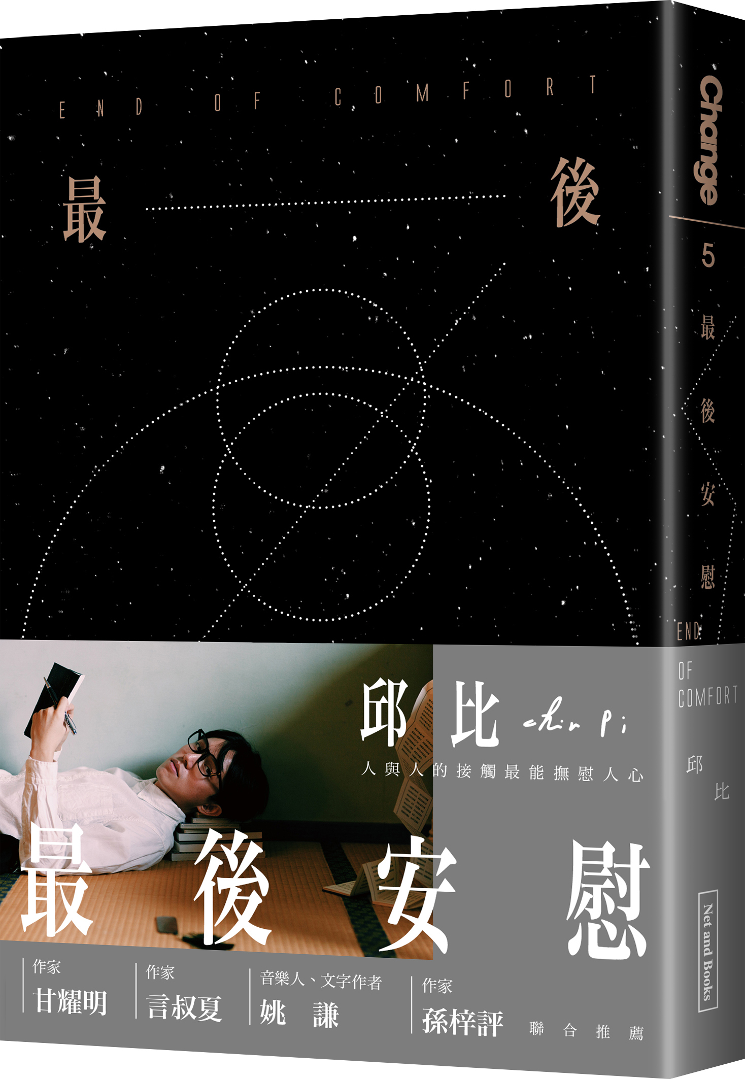 邱比的文字和他的音樂一樣有電氣感,有如脈搏一般捉摸不定的跳動,《最後安慰》穿插寫進了兩個相對而立的世界,毀滅中的世界與重生中的世界,相對而立不見得是對立吧,《最後安慰》是寫給地球人的撫慰物語,而愛是一切僵滯的解套。書中出現這句「數學的真諦,是有例外、有奇特」,所謂的「例外」是被設想成例外的吧,例外是常態的一部分啊,例外的愛其實再成立不過了,邱比把他對於愛的立場表明得堅定,沒有人該被排除在平權之外,愛是萬物而論的。