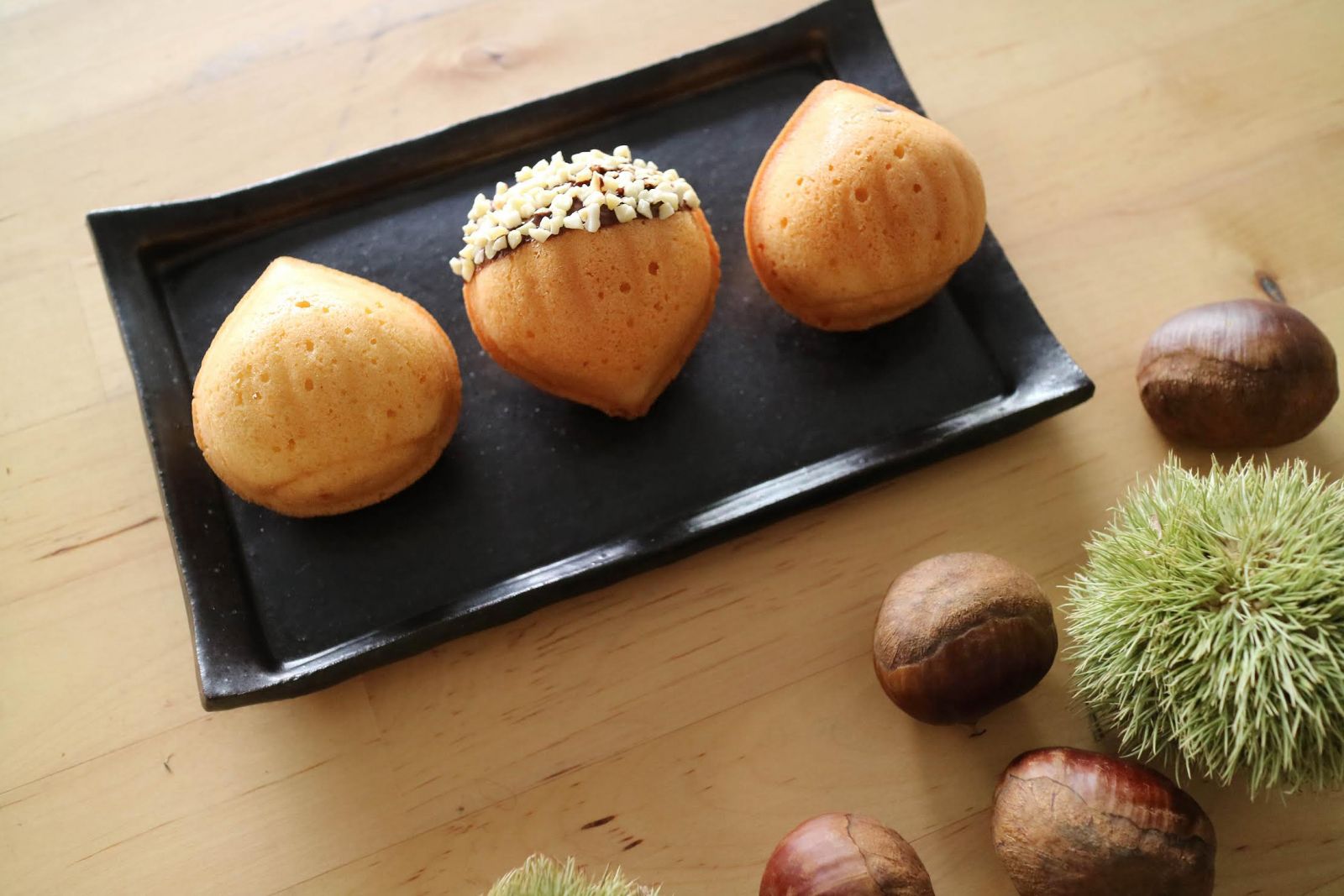 用栗子模型做成的蛋糕,最後沾上巧克力與杏仁果粒,讓它彷彿穿回