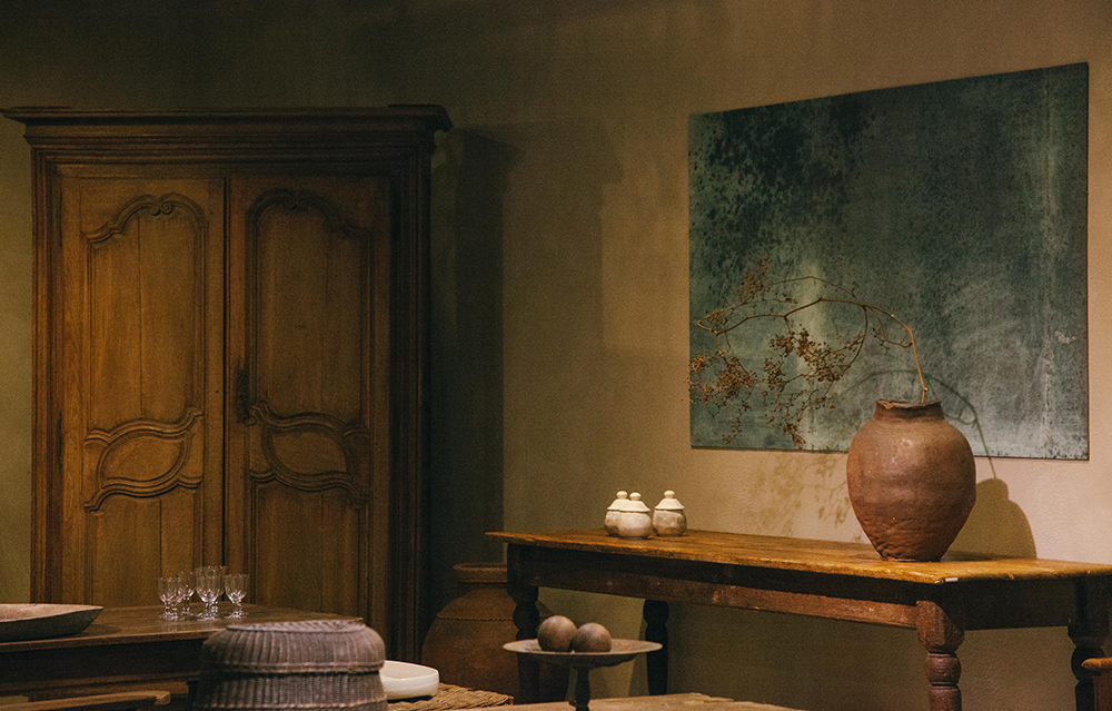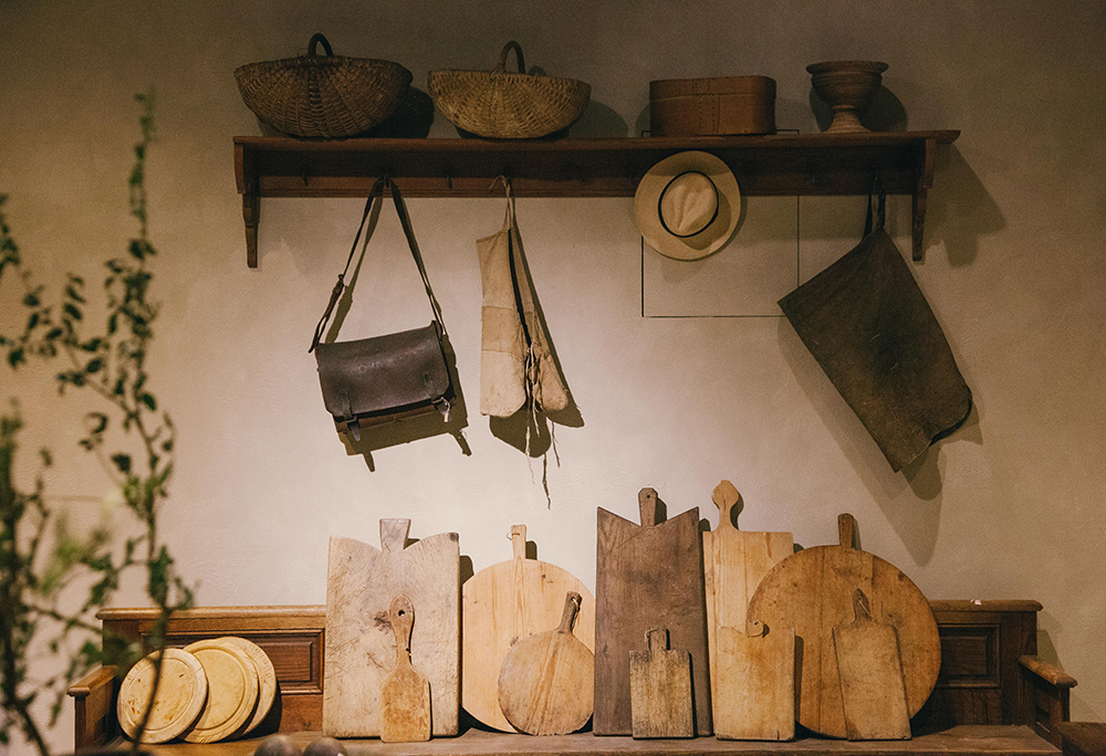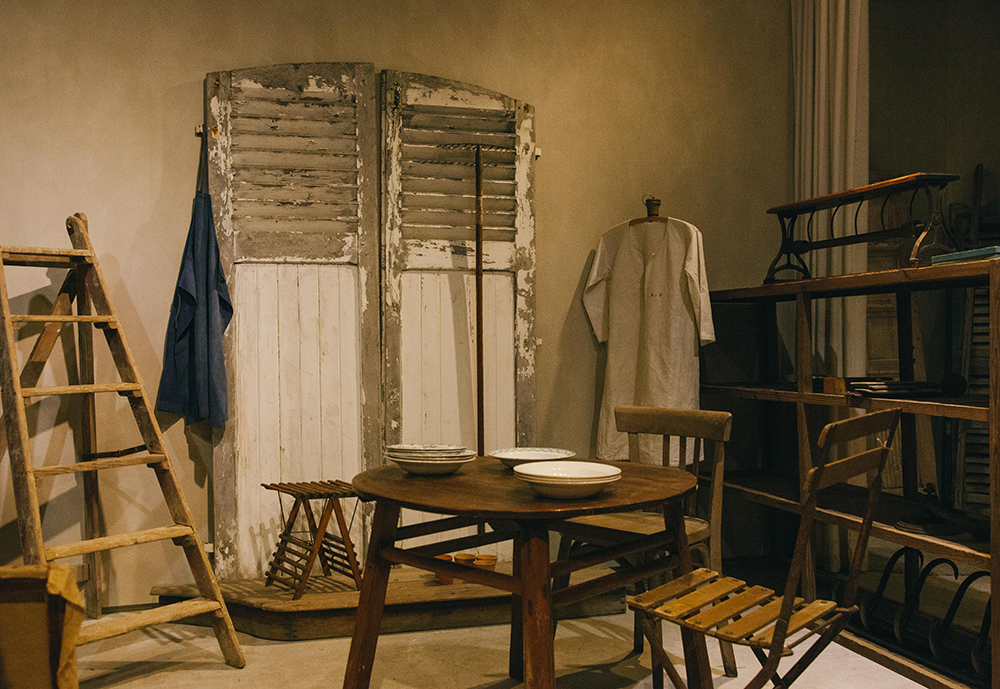 由 delicate antique 古道具策劃的展區,延續 JAMEI CHEN 的簡樸。從法國、英國、比利時等地尋回的木製桌椅和櫥櫃,組成了等待朋友上門的客廳,往後走會一一歷經擺放各種砧板和器具的廚房與餐桌,空間的後方藏有一座衣櫥,象徵了主人最私密的臥房。走進這裡,真的像是拜訪一個古歐洲的家,整體木質色調有種沈穩內斂的美好,而角落的精緻餐盤和酒杯折射出的微光,則低調地展現了主人的生活品味。