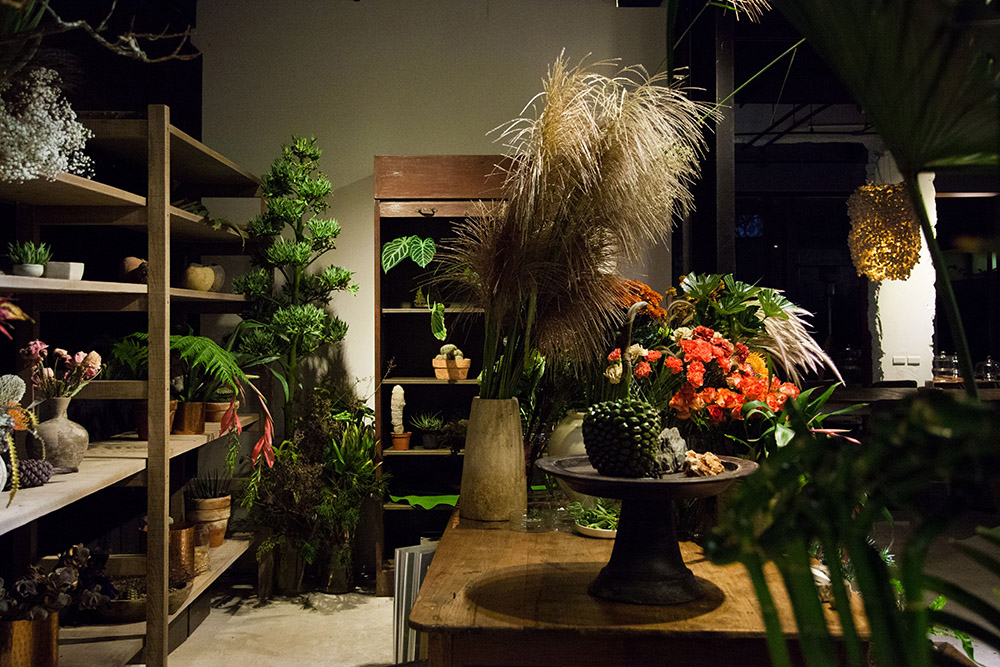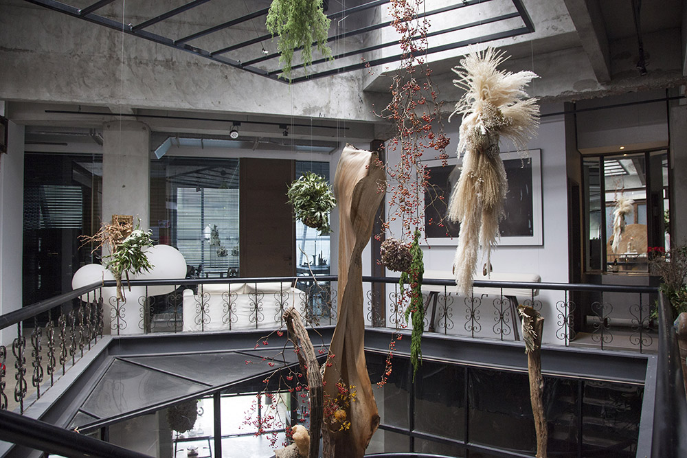 這次展覽的另一個驚喜來自花藝品牌 L&F。創辦人廖浩哲的作品既不甜美也不艷麗,少有張狂的色彩配置,強調植物的紋理和姿態,看似沉靜清冷,卻又訴說著對環境和生活的情感,作為古物與當代生命嫁接的媒介,再適合不過。據說廖浩哲會不經意地出現在另空間,整理花藝、佈置展區,說不定你也有機會遇上。