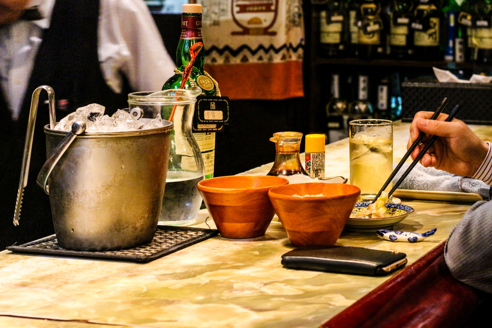 佐藤老闆臉龐稜角分明,身軀魁梧,日復一日穿著一身標準調酒師服,堅守在吧台內。條通人印象中的他,嚴肅、不苟言笑,卻也是個令人尊敬的日本職人。店內不論是調酒、料理均由佐藤老闆一手包辦,俐落的身姿與專注的神情,見證他在日本星級餐廳多年來的歷練。