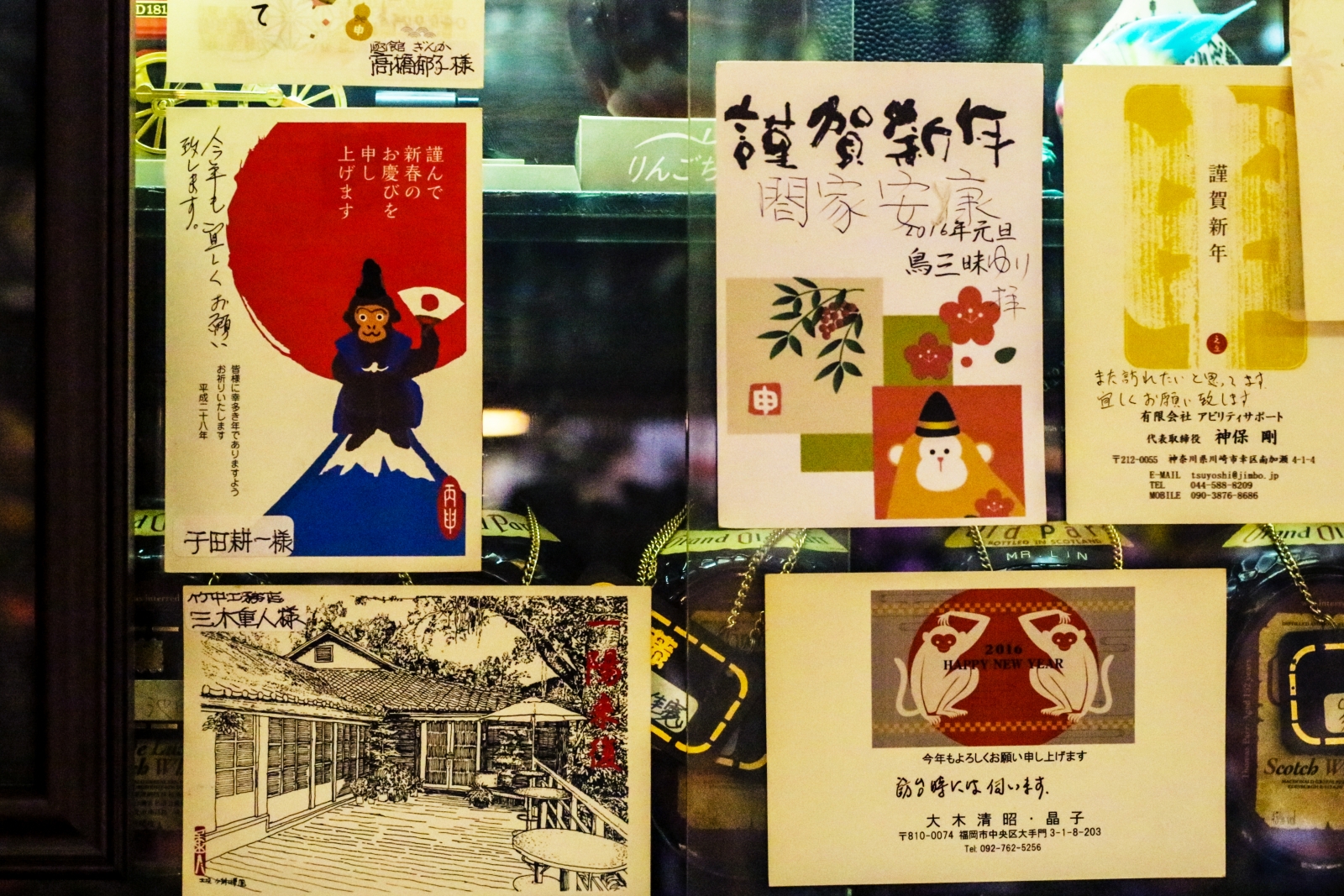「藤」店內每一瓶酒至多可寄放三年,因為三年是一瓶烈酒的最佳賞味期限。但而佐藤夫婦與客人之間的情誼,自然是遠遠超過三年。這濃厚的牽絆之情,又可從店內的另一特殊裝飾——新年賀卡上感受到。每年歲末,年過半百的佐藤夫婦,仍堅持自己設計、寄送附有兩人照片的新年賀卡給店內常客,平均每年要寄上至少千張,而所有能夠張貼、擺放的酒櫃與牆面,也都放滿了今年一年客人們從各地寄來的問候卡或別具意義的紀念品,像是長得像極了佐藤先生的公仔、店內速寫、寫真、難得一見的小瓶酒等。