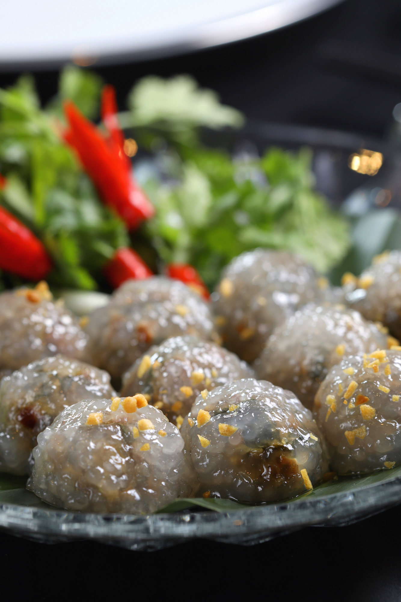 泰國傳統點心 Saku 則是許多外地泰國人最懷念的家鄉味,以西谷米製成外皮,包裹肉末、花生,調和蒜、椰子糖、紅蔥頭、甜菜脯之內餡,小巧渾圓,蒸過後外皮呈現半透明,擺放盤中猶如灑落的圓珠。入口外皮軟糯,內餡鹹香微甜。搭配紅辣椒、香菜一起享用,口中多了香辣層次,風味更加豐富。