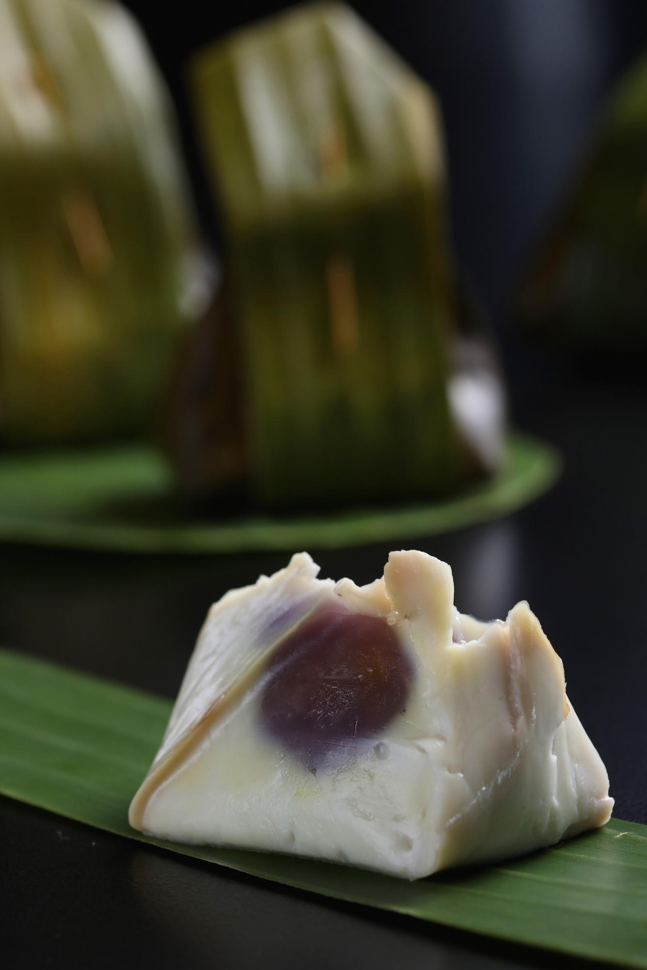 椰球芭蕉葉手法繁複,一般餐廳較為少見,以棕櫚糖、椰絲炒乾成餡料,先包上糯米皮,再淋上在來米粉與椰奶調成的米漿,包入芭蕉葉同蒸。入口先是椰奶鹹香濃郁的氣息,接著是軟糯口感與香甜椰絲,鹹甜交織的滋味令人回味無窮。