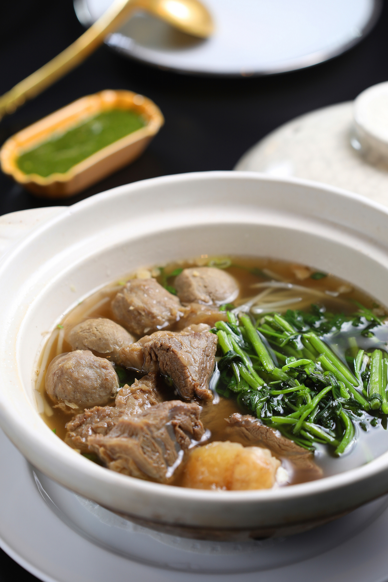 以牛骨、黑胡椒、芫荽根、洋蔥、八角、肉桂熬製湯底一日,再加入牛小排、牛腱肉、牛筋、牛肉丸、空心菜、豆芽菜同煮,外觀雖似台灣的清燉牛肉湯,但清澈爽口湯頭飄散出的特有香氣又更勝一籌,牛筋讓清湯富有膠質。豐富的配料,讓您一次盡嚐每日手工製作牛肉丸的彈牙、軟嫩略帶口感的牛腱肉、Q 軟化口的牛筋,與爽脆甘美的蔬菜,鮮甜滋味口中縈繞不絕。