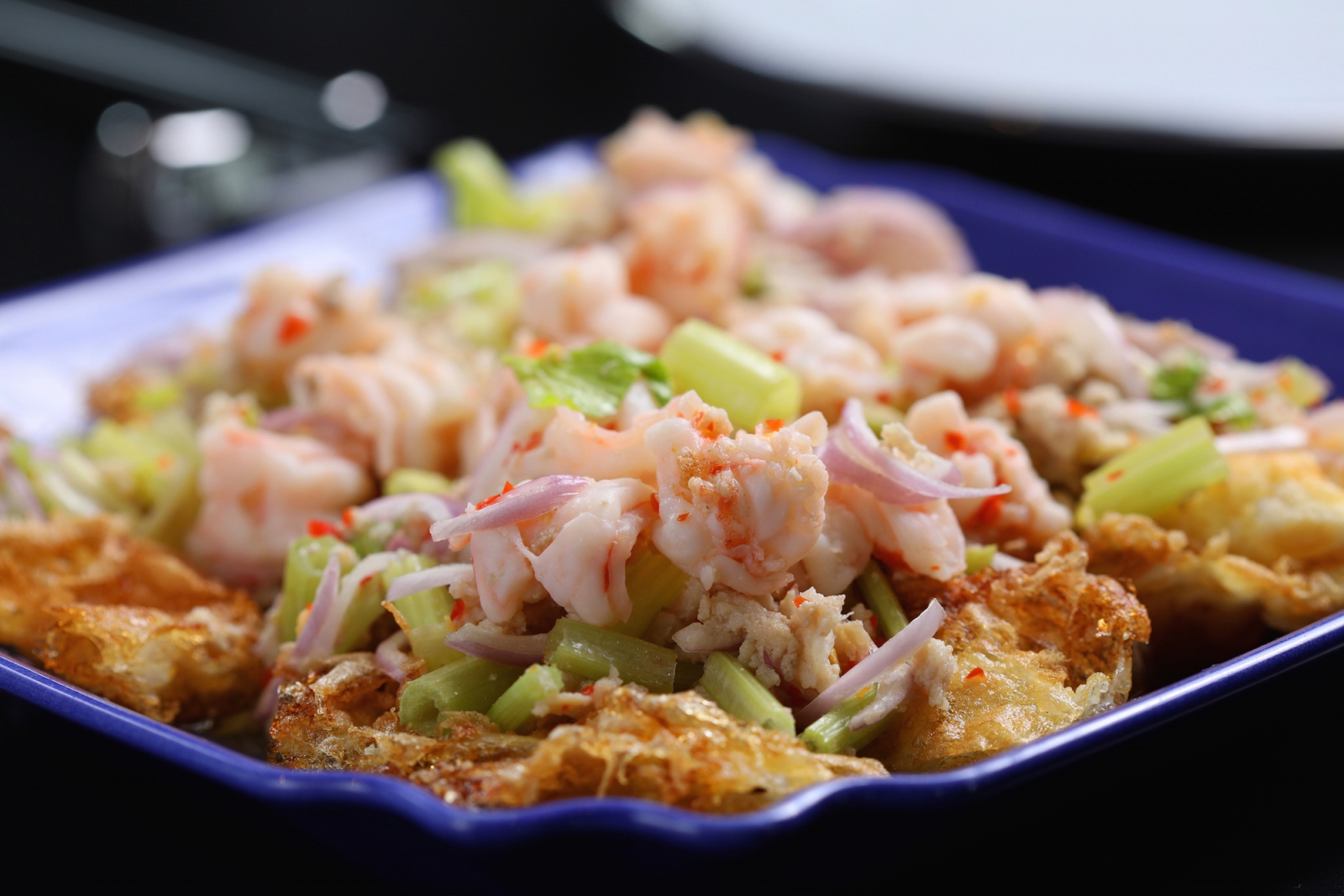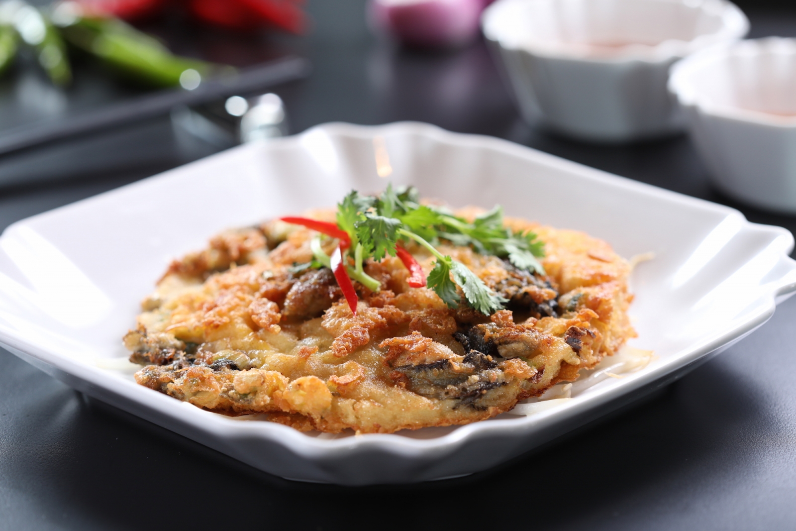 此道蚵煎為泰國街邊鐵板小吃 Hoi Tod,與台灣小吃蚵仔煎相似。泰式作法混合雞蛋、鮮蚵、蔥、蒜與粉漿,煎炸至金黃酥脆,下方再鋪上一層炒過的豆芽菜,蚵煎口感鮮香扎實,搭配豆芽菜吃十分爽口,不似台灣蚵仔煎的蛋糊混合蔬菜並加入較多太白粉勾芡後較為 Q 軟。沾佐特製辣椒醬享用,增加甜辣滋味。