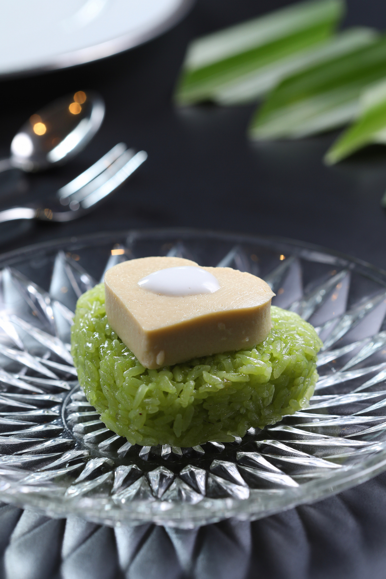糯米飯為泰國街邊常見的甜點,最常見的是搭配芒果。由於台灣四月尚非芒果產季,此次以泰式布丁搭配甜糯米,將糯米蒸熟後拌入七葉蘭汁及砂糖,染成屬於春天的綠色,搭配充滿椰奶溫潤、甜香滑嫩的泰式布丁,淋上些許香甜椰奶,糯米 Q 軟微甜,散發七葉蘭幽香,與泰式布丁展現不同層次的口感與甜味。