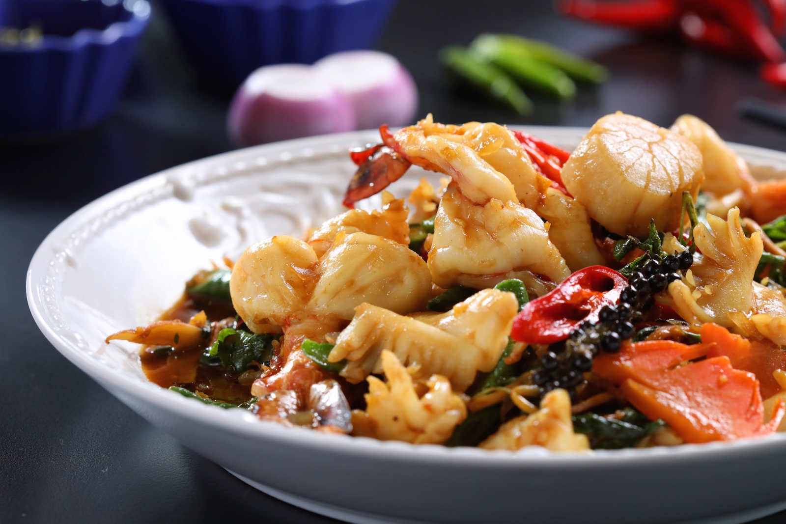 選用明蝦、生食等級干貝、透抽,與泰國進口的新鮮綠花珍珠胡椒,帶有麻香與辣味,與洋蔥、紅辣椒、甲猜、檸檬葉、打拋葉等辛香料,以泰式黑抽快火拌炒,再加入長豆、玉米筍、紅蘿蔔等蔬菜增添色彩及均衡口感。甲猜的味道似薑、卻又比薑柔和,泰式黑抽帶甘甜不死鹹,海鮮口感彈牙鮮美,整體香辣夠味,屬於口味較重的泰國東北菜式。