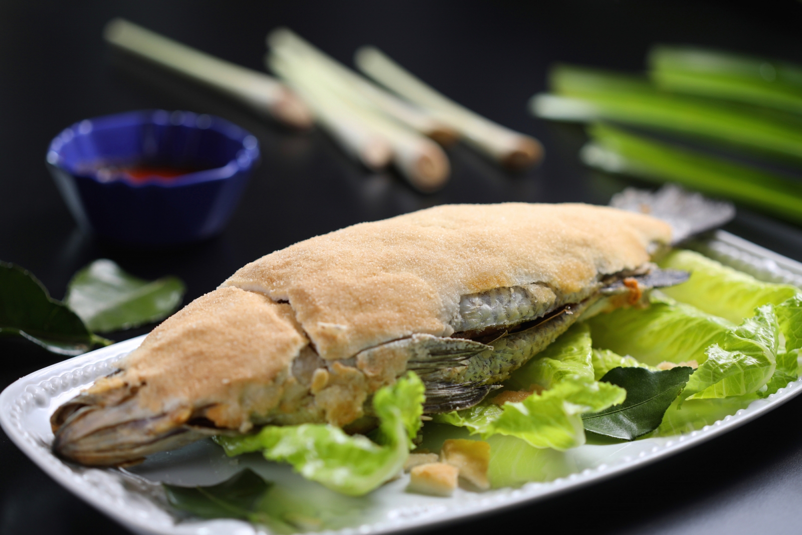取新鮮鱸魚,魚腹中塞入香茅、七葉蘭、檸檬葉,以粗海鹽包裹後炭烤,肉質鮮甜細緻,淡雅鹹鮮中飄散出南洋香料特有的馥郁芬芳,搭配主廚特製香辣海鮮醬,將鮮魚風味提升至另一層次。