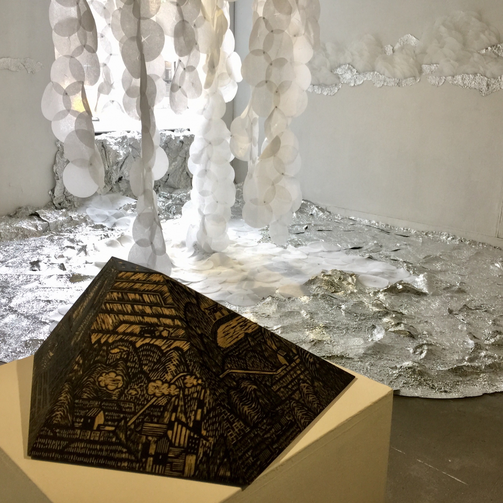 攝影技術出現後改變了本真性與模仿的關係,這樣的說法不是什麼新鮮事。但即使看似方便的手法中,藝術家的勞動從來沒有消逝。最近這個在台北國際藝術村展出的雙個展,重現日本兩地駐村的經驗,現場我們可以看到一些照片、資料拉近觀眾與兩地的距離。蔡坤霖的駐村地點位於日本山口縣美祢市的秋吉台,是日本最大喀斯特台地。這個二戰時期作為後勤補給的地區,兵工廠的遺跡被保留了下來。地形富含碳酸鈣的鐘乳地形與曾經提供奈良大佛銅料的長登銅山,是此地著名的景點,其中煉銅產生的廢氣在地景中有著與金瓜石外貌相似的廢煙道。張雅萍以長桌展示的地圖與照片讓觀眾或多或少想像駐村的活動區域,以金澤的靜謐、緩慢的生活步調去聯想。這個展覽透過了「這裡是秋吉台」與「這裡是金澤」兩個命題來闡述駐村經驗的產物。展覽的搬移,原地記憶再現的困難,透過作品給予了一種解釋。以張雅萍為例,在展覽中他並未藉由聞名的金箔作為發想,而是聚焦在犀川和淺野川與海岸風景給予他的感受,現場裝置了以半透明布與鋁箔的手工作品,在時空的距離中呈現著水相的體感。蔡坤霖的作品更成為一種經驗的餘緒,展場的創作呈現了經驗如何透過裝置的組合與版畫的呈現構成記憶之盒。此處藝術家的記憶書寫過程,也正是藝術史終結後,各種小敘事在作品上流動的現象。