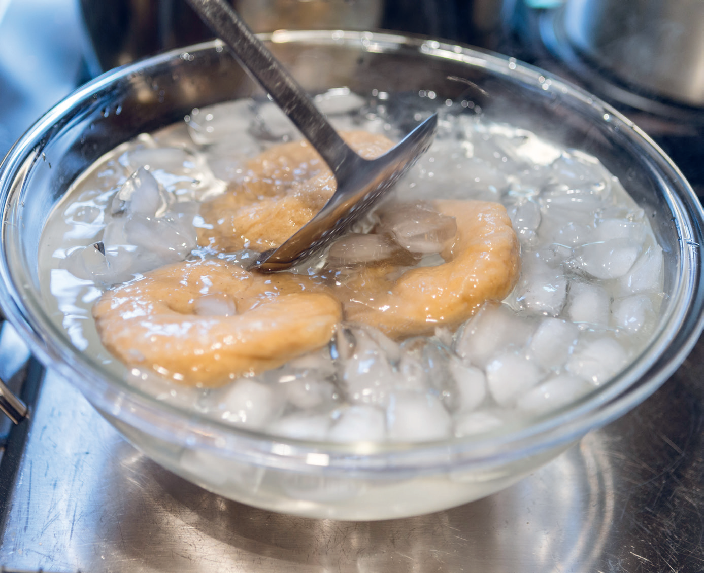 雖然不是很清楚為什麼這種做法會讓貝果更美味,但是想想值得一試,所以在我第二十四次貝果配方實驗時,我烤了一批用初次發酵法發酵的貝果,同時還有一批用一樣的麵團,但是是整形過後低溫發酵的麵團。噹噹!老麵麵種為底,麥芽精添加甜味,初次發酵法所做的貝果,不費吹灰之力就贏了。