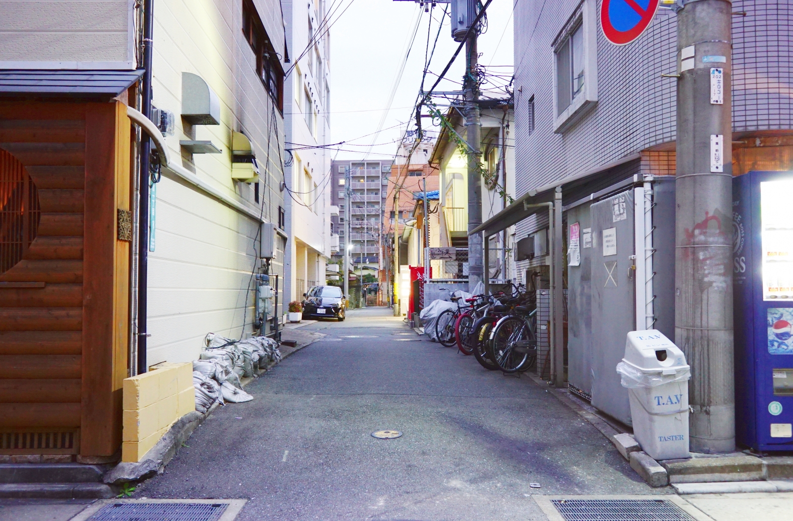 從福岡熱鬧的天神區搭乘計程車或公車,大約十分鐘的距離就能抵達警固。街上公寓、餐廳與服飾店林立,並從大街分支為彷彿會使人迷路的細小巷弄。這回要介紹的「隱密公寓」就是位在只有當地居民才會經過的小巷裡,這裡從一般住宅轉為商業租屋後,連帶改變了人潮的流動。