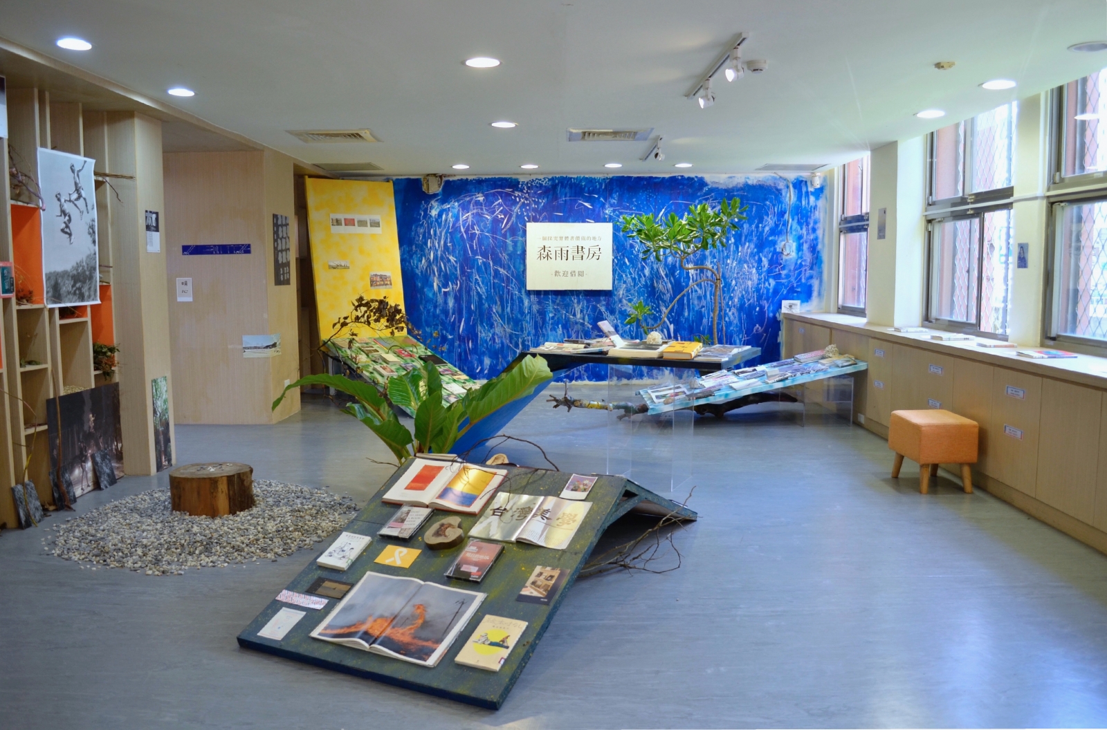 陽光灑落的空間內,一排排書籍或開或闔,平放在各式書桌、架子、布匹上。枯木、石頭疏空隨興地陳綴左右,像從樹間落下,或從海上漂來。一旁白底黑字的板子寫著:「一個探究實體書價值的地方/森雨書房/歡迎借閱」。