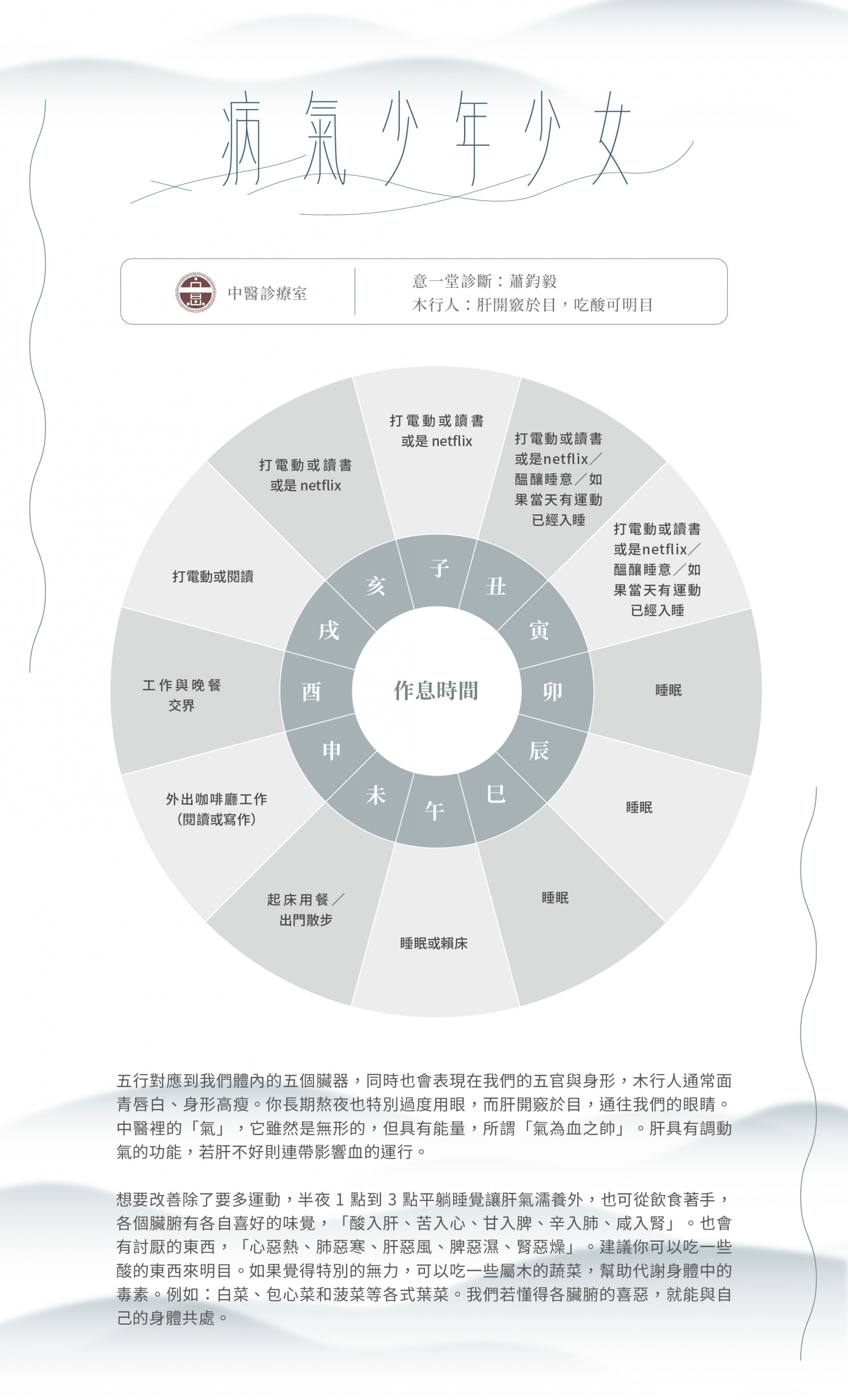 意一堂中醫診所根據患者病症,並透過其生活作息與五行類別,做出以下診斷: